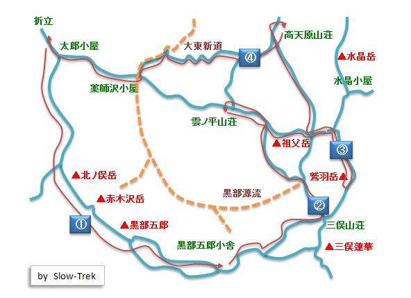 黒部五郎小舎(06:40)−黒部乗越(08:10)−三俣山荘(09:35−09:50) 源流標(10:30)−雲ノ平山荘(13:00) |