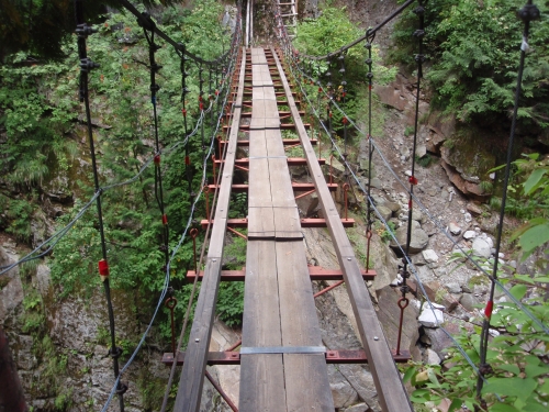 ダムから90分、岩盤を少し高巻きして進むと目の前には吊り橋
