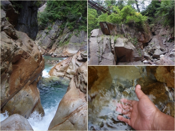 足元の危うい岩場に座り込み流れに手を・・・想像通りの冷たさに思わず手を引く