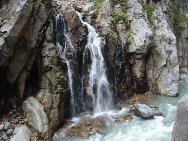 急に狭くなる廊下の対岸からは滝が流れ落ちる