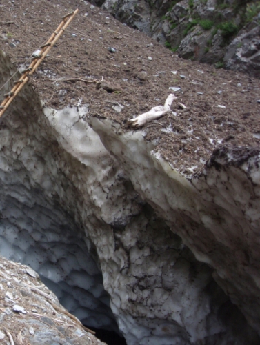 ヒヤヒヤしながらハシゴから登山道へ降りると、阿曽原温泉の青年が寒そうに立って