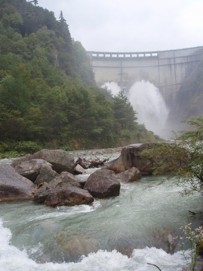 阿曽原から6時間と30分、三日ぶりに戻った黒部ダムでは、観光放水の真っ只中